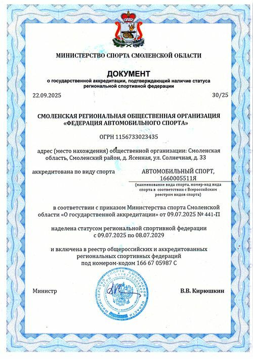 Документ о государственной регистрации, подтверждающий наличие статуса региональной спортивной федерации